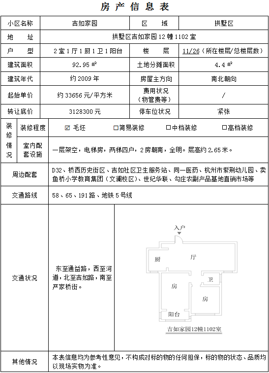 2 | 杭州市拱墅区吉如家园12幢1102室 | 92.95 | 3128300 |