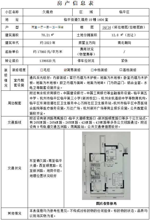 转让底价 | 1396820 元 | 资产所在地区 | 浙江省,杭州市,临平区 |