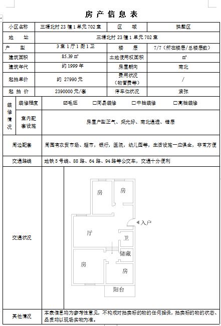 标的名称 | 三塘北村23幢1单元702室房产 | 标的编号 | HJS2020ZC1126 |