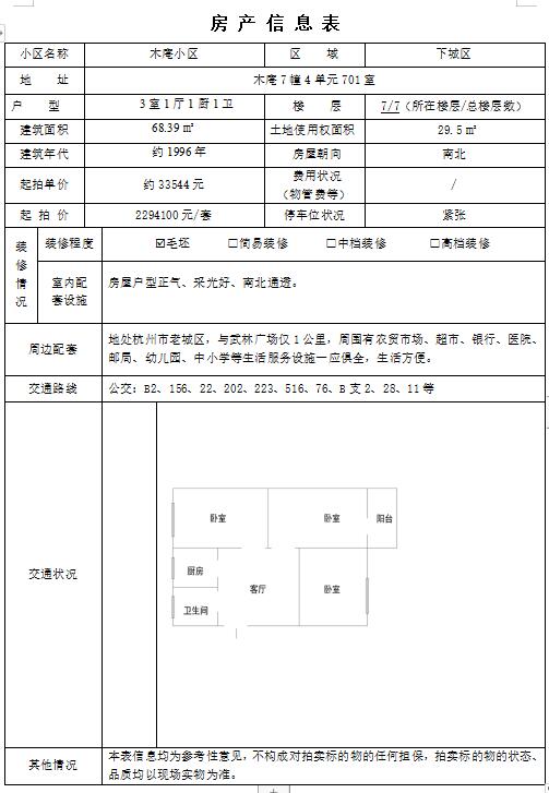 其他披露事项 | 1、交易标的的房屋建筑面积和土地使用权面积均以权证核定的面积为准。2、房屋质量、具体位置等以现场实际为准,房屋的装修部分不以展示现状为准,房屋在移交时,不保证装修、装饰物的完好。 |