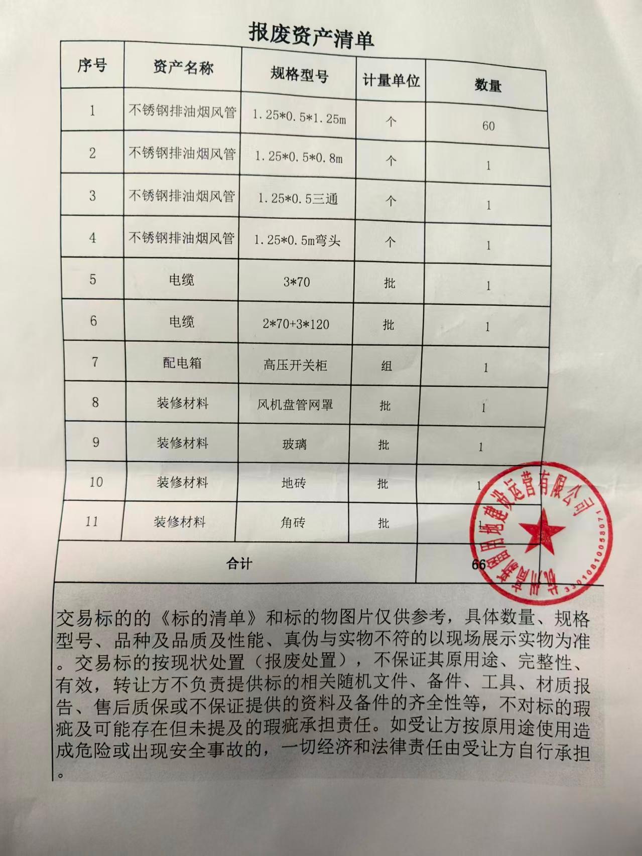 1、本项目经依法展示后举行,标的以现场实物展示为准,意向受让方应当详细阅读本项目所涉及披露内容,有责任自行了解标的的状况,认真进行现场踏勘。意向受让方提交受让申请并且交纳交易保证金后,即视为已详细阅读并完全认可本项目所披露内容以及已完成对标的的现场踏勘,表明已完全了解并自愿接受标的的全部现状及瑕疵,并自愿承担一切交易风险。 2、意向受让方须书面承诺: (1)同意在被确定为受让方之日起5个工作日内签署《资产交易合同》、《安全、消防协议书》;并在《资产交易合同》、《安全、消防协议书》签署之日起5个工作日内向杭交所指定账户一次性支付交易服务费、履约保证6000元、交易价款等交易资金(以到账时间为准); (2)同意杭交所在经转让方申请之日起3个工作日内将受让方已交纳的交易价款全部划转至转让方指定账户。 (3)知悉并承诺:交易标的的《标的清单》和标的物图片仅供参考,具体数量、规格型号、品种及品质及性能、真伪与实物不符的以现场展示实物为准。交易标的按现状处置(报废处置),不保证其原用途、完整性、有效,转让方不负责提供标的相关随机文件、备件、工具、材质报告、售后质保或不保证提供的资料及备件的齐全性等,不对标的瑕疵及可能存在但未提及的瑕疵承担责任。如受让方按原用途使用造成危险或出现安全事故的,一切经济和法律责任由受让方自行承担。 (4)知悉并承诺:受让方认可其在向杭交所提交受让申请并且交纳交易保证金之前,已在交易标的展示地对交易标的进行了认真的现场踏勘,已完全了解并自愿接受交易标的的全部现状及瑕疵,并自愿承担一切交易风险。受让方同意按照交易标的现场展示之现状接受交易标的,受让方对交易标的的质量等没有任何异议。无论何时、何种原因,受让方不得对交易标的的质量等提出任何主张,也不得要求转让方承担任何维修义务。 (5)转让方不保证基于交易标的产生的废品是可用的,不保证其完整性、品质及其原用途,不负责技术质量保证及售后服务,不承担一切瑕疵担保责任,并且不能保证主体和附件是否完好无损,均以现场实物现状为准。资产状况、数量与质量均以移交时的实物现状为准,本次披露的《标的清单》及照片仅供参考,不代表标的资产与其完全一致。无论受让方将废品用于何种目的(包括但不限于出售),转让方均不承担任何责任,受让方自行承担废品再生利用过程中的一切责任。 (6)知悉并承诺:受让方需自行了解为完成标的资产清(拆)运工作所需的国家及标的所在地法律法规规定资质、条件和限制,如因意向受让方不符合相关政策法规的规定或按原用途使用而造成危险或出现事故的,责任由意向受让方承担。 3、意向受让方须自行了解其对转让标的受让事项是否符合中国现行法律法规及标的所在地相关政策。 4、本次交易标的的交付,受让方付清交易服务费、履约保证金、交易价款等交易资金后,由转让方负责与受让方办理。 5、本项目标的交付、转受双方的权利义务以及拆除的相关要求以转让方提供的《资产交易合同》(样本)及《安全、消防协议书》(样本)为准 |